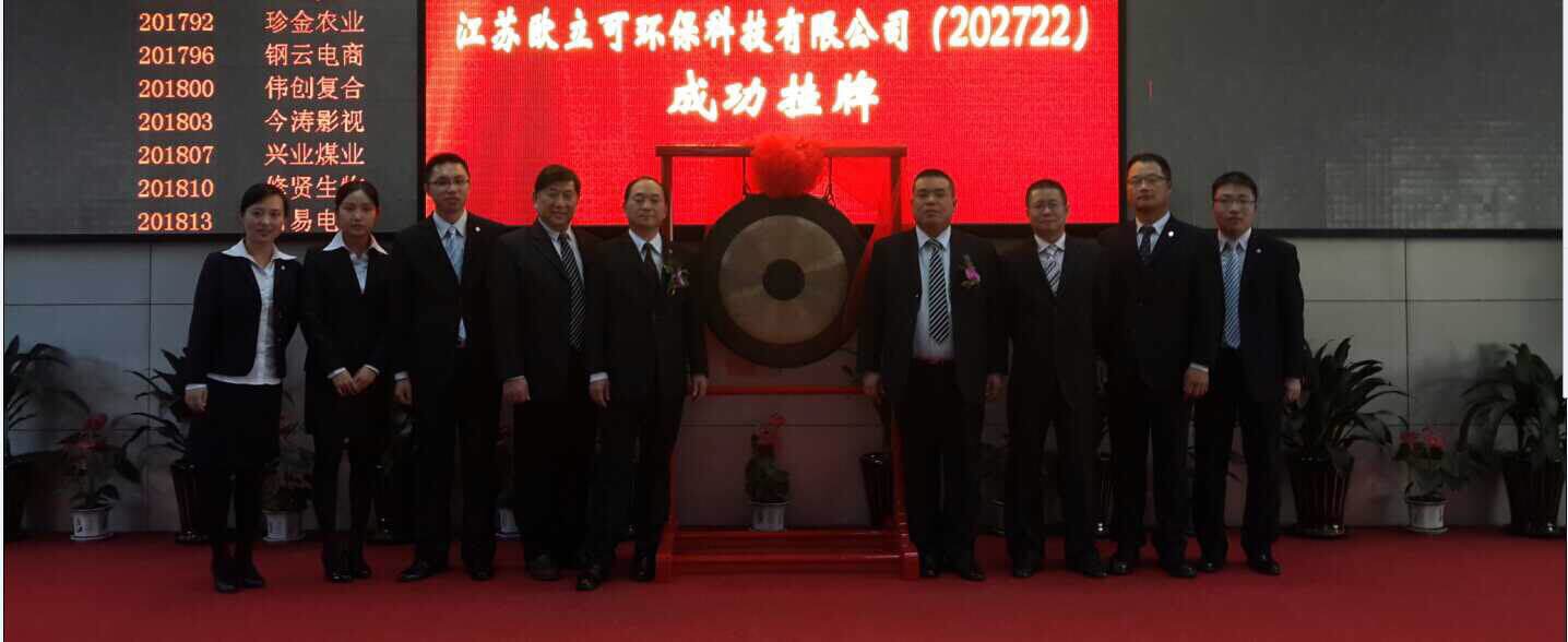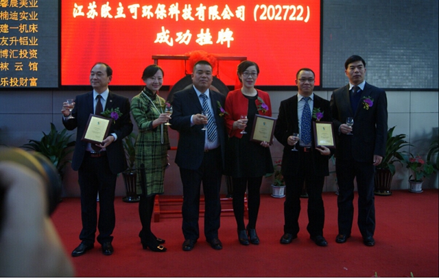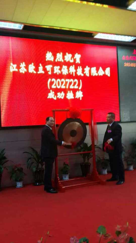2014年12月5日中午11點(diǎn)18分,鳴鑼掛牌儀式在上海股權(quán)交易中心隆重舉行,江蘇歐立可環(huán)保科技有限公司董事長豐偉、總經(jīng)理李繼強(qiáng)等高管出席掛牌儀式。江蘇歐立可環(huán)保科技有限公司董事長豐偉上臺(tái)致辭,他介紹道:歐立可自成立以來一直專注節(jié)能減排、綠色環(huán)保的產(chǎn)品研發(fā)及生產(chǎn),針對水處理與節(jié)省燃?xì)獾认到y(tǒng)性解決方案,堅(jiān)持創(chuàng)新、高效、團(tuán)結(jié)、誠信,通過持續(xù)的技術(shù)創(chuàng)新和不斷突破,取得了今天輝煌的成就。