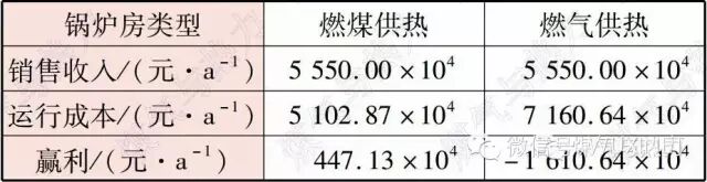 從表7可知,運行一個供暖期,燃煤供熱能贏利447.13×104元,燃氣供熱則虧損1610.64×104元。