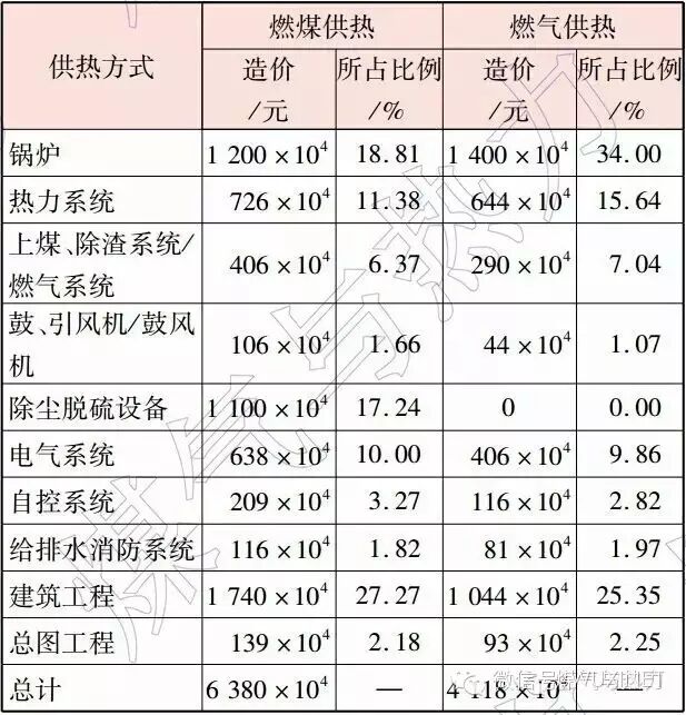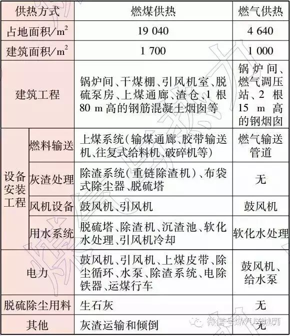 為了減少燃煤帶來的污染,GB13271——2014《鍋爐大氣污染物排放標準》對燃煤、燃氣鍋爐房的污染物排放濃度提出了限制要求,為了達到這種要求,要求對燃煤鍋爐房進行排煙除塵,需要加設脫硫除塵設施。本例燃煤鍋爐房采用布袋除塵器+脫硫塔兩級除塵脫硫,除塵效率可以達到99.6%,脫硫效率能達90%。這樣可以極大減少對環境的污染,但是勢必增加造價和運行費用。不僅如此,在工程建設方面,燃氣供熱方式也優于燃煤供熱方式,工程比較見表4