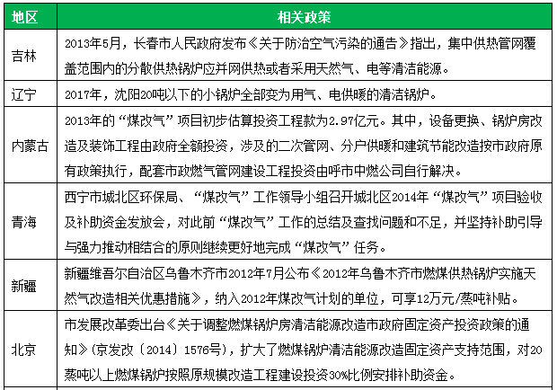 據了解,國內煤炭產地相對集中在內蒙古、黑、吉、遼、晉、冀、魯、豫、皖等地,北方市場作為主要資源消費區,在每年冬季的取暖季,從東北到華北則會出現大面積的霧霾,作為主要整治區域,北方各省市的取暖用燃煤鍋爐成為了“煤改氣”的焦點。